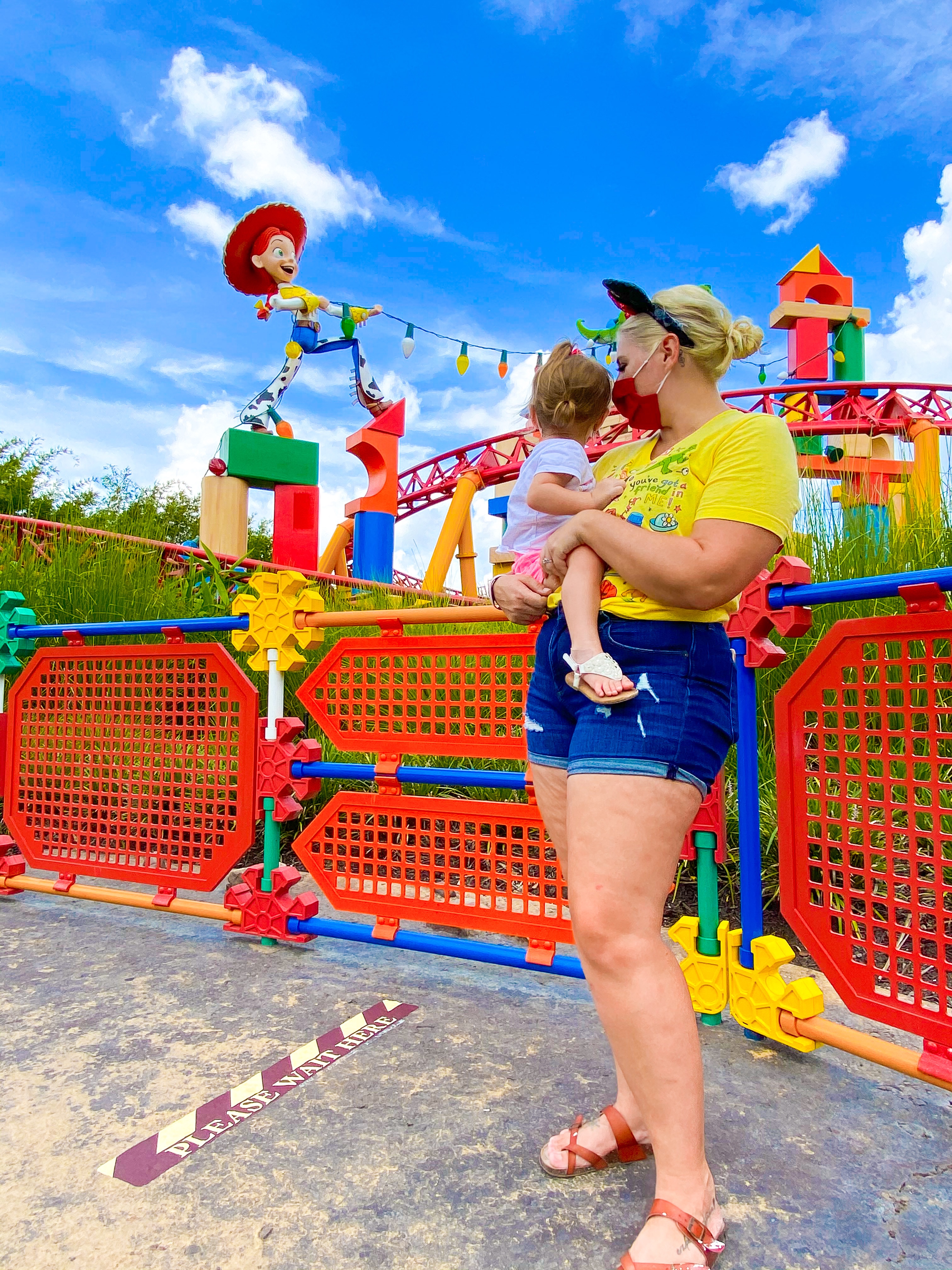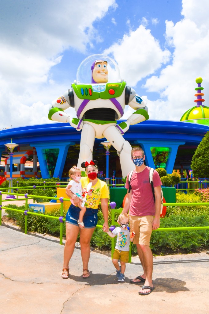 At that point if you are needing a break from the heat, definitely check out Lightning McQueen’s Racing Academy. Shows are every 15 minutes and they are keeping it pretty cool in there. Even with the mask on, I felt refreshed when I got out of there. At that point Rise had been down for a minute and it was saying we had 55 minutes until our boarding group would be called, so we decided to venture back to Toy Story land so the kids could get some rides in.